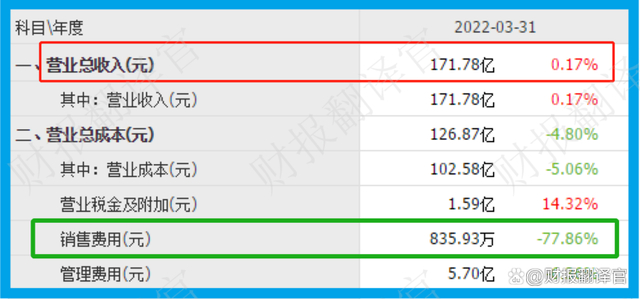 2022年第一季度,公司的营业收入同比增长了0.17%。而对应的销售费用不仅没有增长,反而还降低了78%。