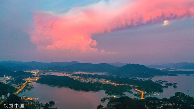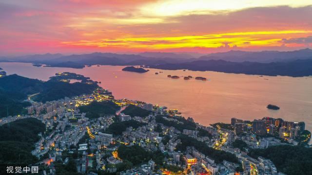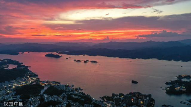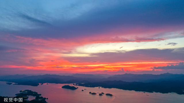 2022年8月10日傍晚,杭州,千岛湖晚霞漫天,火烧云满布夜空,色彩斑斓。火烧云是一种自然现象,是指日出或日落时出现的赤色云霞,是大气变化的现象之一。
