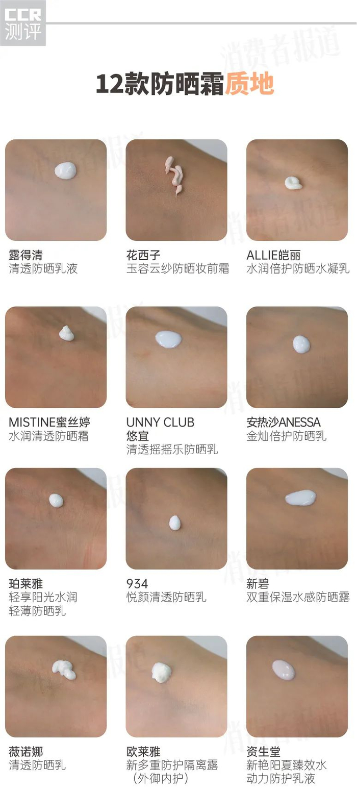 12款防晒霜中,花西子、ALLIE皑丽、蜜丝婷、934、薇诺娜、欧莱雅、露得清等质地偏乳霜状,UNNY CLUB悠宜、安热沙、新碧、资生堂、珀莱雅等摇摇乐类防晒霜则偏水状,流动性较强。