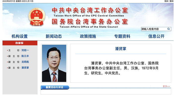 8月11日,界面新闻自中共中央台湾工作办公室、国务院台湾事务办公室网站获悉,潘贤掌已任中共中央台湾工作办公室、国务院台湾事务办公室副主任。