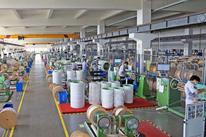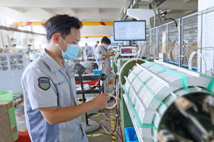 上海北变科技有限公司专注于高压变频器配套业务,是一家专业生产变频调速用干式整流变压器和高低压电抗器的高新技术企业。其产品技术国内领先,达到国际先进水平。公司现有3万多台产品应用案例,最大容量已达到17000kva,生产的变压器广泛用于钢铁、水泥、石油、风电、水电、市政、矿业、新能源、数据中心、充电桩、煤炭海洋运输等行业领域,并出口海外市场。图为生产车间产线场景。 记者 岳诚/摄