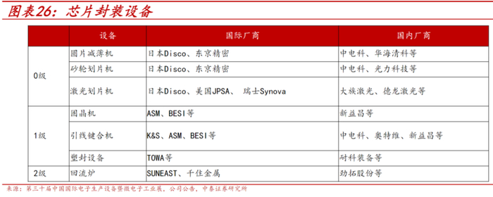 封装设备主要有磨片机、划片机、固晶机、键合机、塑封设备、打标设备等。冯胜表示,先进封装有望增加设备需求,主要为研磨设备增加(晶圆需要做的更薄)、切割设备需求增加、固晶设备(DieBond要求更高)。此外,新设备需求主要为:如凸块(bump)工艺涉及到曝光、回流焊等设备;TSV工艺增加新设备需求。