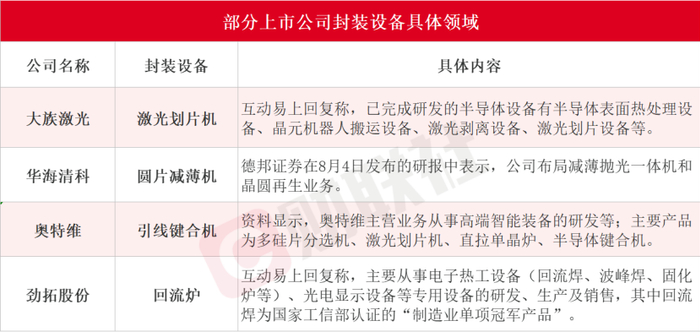 据财联社整理,大族激光、华海清科、奥特维、劲拓股份这四家公司在封装设备布局的具体业务如下: