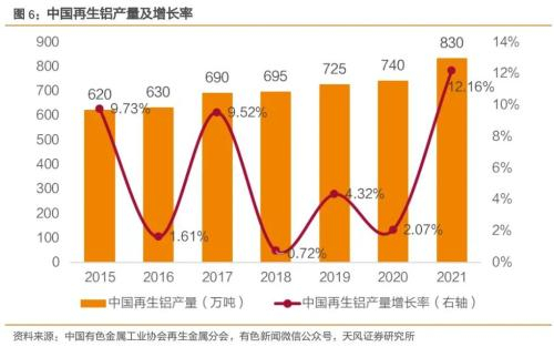 近年再生铝产业稳定增长,双碳战略引领下再生铝占铝产量比例或有较大提升空间。中国再生铝行业发展稳中有升,根据中国有色金属工业协会再生金属分会及有色新闻的数据,中国再生铝产量从2015年到2021年的年均复合增长率为4.98%,2021年中国再生铝产量为830万吨,同比增长12.16%,实现产品产值约1800亿元,同比增长38.5%。