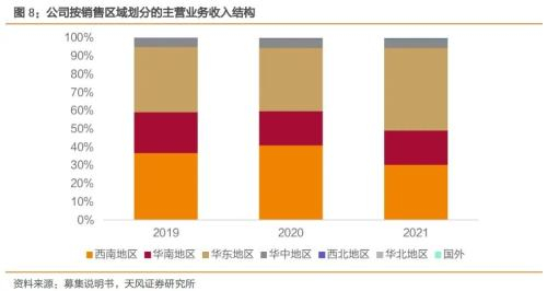 产能扩张以实现生产区域多元化布局,促进全国市场的进一步覆盖。公司主营业务收入主要集中在西南、华南和华东三个销售区域,2021年这三个区域的合计收入在主营业务收入中的比例约为95%。2019年和2020年西南地区的销售收入占比最高,而2021年华东地区的销售收入反超西南地区,占比最高。与之相对应的是,公司在西南、华南和华东三区都有生产基地,分别位于重庆、广东清远、江苏溧阳。2021年,重庆、广东清远、江苏溧阳和湖北襄阳四个生产基地的产能分别为27.59万吨、11.53万吨、15.21万吨及9.62万吨,合计约64万吨。