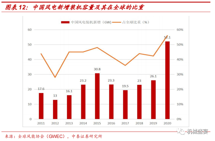 风电装机规模有望快速增长。“十三五”期间,在“碳中和”及“风光”总装机12亿千瓦以上双重目标下,我国风电每年平均新增装机至少需达50GW,新增市场规模潜力巨大,发展超大型风电机组是实现风电平价上网的有效措施之一。国家近年来发布风电领域相关政策,大力推广及鼓励风电领域的发展,我国风电产业将实现平稳有序发展,风电装机规模继续领跑全球。2020年,中国新增装机容量52.08GW,包括陆上新增风电装机容量49.06GW 和海上风电新增装机容量3.02GW,新增装机容量在全球比重为56%。
