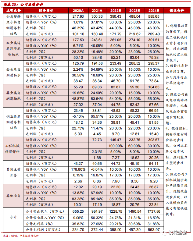 公司是我国自润滑轴承行业龙头企业,产品远销海外,客户资源优势突出,是中国核心零部件“进口替代+走出国门”的典型代表。受益于公司汽车及工程机械等下游行业的持续回暖,公司业绩快速增长可期。此外,滑动轴承替代滚动轴承有望在风电领域快速渗透,风电业务有望打开公司第二成长曲线。考虑到原材料价格有望逐步回落,公司盈利能力改善可期;我们上调公司盈利预测,预计2022-2024年的归母净利润分别为1.94、2.53、3.11亿元(前值分别为1.76、2.07、2.39亿元),对应的PE分别为35.4、27.1、22.1倍。维持“买入”评级。