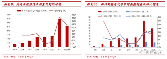 新能源汽车需求表现强劲。近些年新能源汽车增长持续看好,继2021年新能源增速高达165.10%后,上半年增长表现持续优异。其中,2022年6月,国内新能源汽车销售59.64万辆,同比增长133.21%。对于新能源汽车的不同类型而言,插电式混动新能源汽车销量在2021年增速达143.98%后,今年上半年再创新高达168.77%。随着新能源技术的突破、市场的认可以及政策的大力支持,新能源汽车有望迎来爆发式增长。