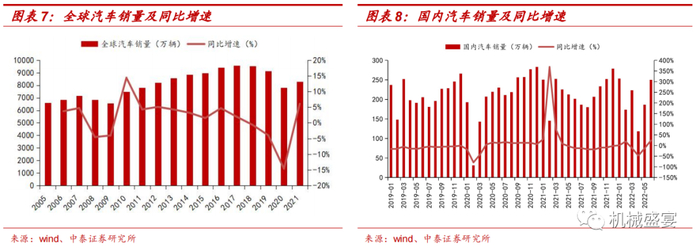汽车行业需求自6月份开始复苏。汽车产业是我国国民经济的支柱产业之一。伴随着我国经济持续稳健增长以及人民生活水平的提高,汽车需求量不断增加。2021年,全球汽车销量为8268.48万辆 ,同比增长6.05%;国内汽车销量为2624.83万辆,同比增长3.88%。自2021年5月份以来,国内汽车月度销量开始有所下滑,但是随着下半年疫情缓和与经济政策宽松,汽车行业迎来需求的复苏。2022年6月,国内汽车销售250.23万辆,同比增长24.16%。随着需求逐步释放以及消费逐渐恢复,中国汽车销量有望持续保持快速增长。