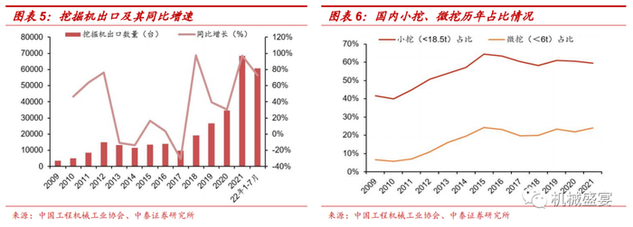 出口海外及机器代人成为平滑行业周期性波动的重要力量。2021年,中国挖掘机出口6.8万台,同比增长97.0%。2022年1-7月,挖掘机出口60655台,同比增长72.6%;其中7月份出口8689台,同比增长73.2%。挖机出口的快速增长预计将有效平滑国内挖机销量的下滑。目前小微挖占挖机国内市场销量的比例较2009年明显提升;2021年,小挖(18.5吨以下)占比达到59.4%,微挖(6吨以下)占比达到24.1%,虽然占比明显提升,但与欧美发达国家相比依然较低。工程机械对体力劳动者的替代作用逐步凸显,小微挖等工程机械产品在农村市场的应用逐步增多,应用领域的不断拓展也将为工程机械行业带来新的增量。