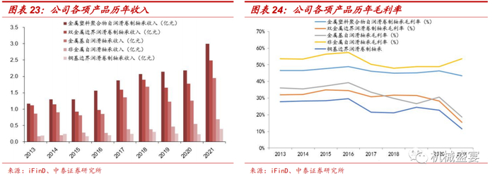 ②高毛利产品占比提升有望进一步推动公司盈利能力提升。汽车行业主要使用金属塑料聚合物自润滑卷制轴承,伴随着汽车产销量的逐步复苏,公司汽车领域订单快速提升,汽车业务占比有望逐步提升。而金属塑料聚合物自润滑卷制轴承的毛利率在40%以上,高毛利产品占比的提升也有望进一步带动公司盈利能力的逐步回升。