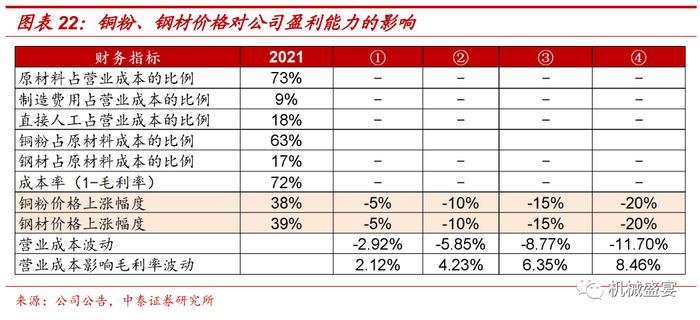 ②假设2022年铜粉价格和钢材价格相较于2021年下降-10%,则公司毛利率将会提升4.23个百分点;