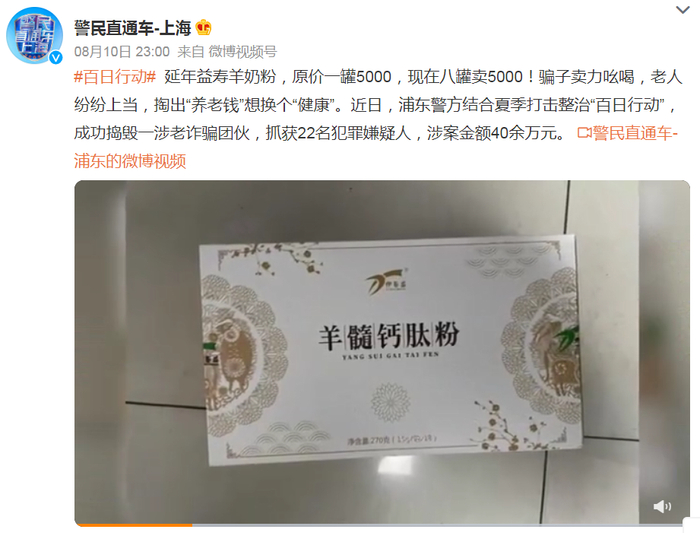 近日,上海浦东警方成功捣毁一涉老诈骗团伙,抓获22名犯罪嫌疑人。该团伙声称其推销的羊奶粉等产品对高血压和糖尿病有帮助,经查,涉案保健食品的出厂价格和该团伙的实际销售价格最高相差十几倍。警方梳理发现,上海有80多位被害人,涉案金额40余万元。目前,张某等5人因涉嫌诈骗罪已被警方刑事拘留。