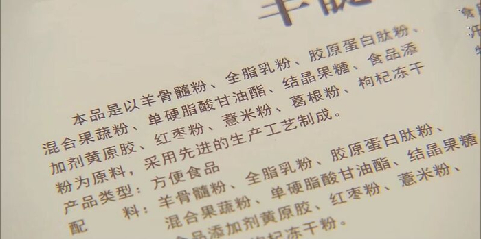 警方查获的上述羊奶粉保健品名为“羊髓钙胎粉”,配料表中“羊骨髓粉”和“全脂乳粉”位于第一、二的位置。商家把羊奶和羊骨髓加在一起,号称这些“珍贵食材”能治疗糖尿病高血压、延年益寿。