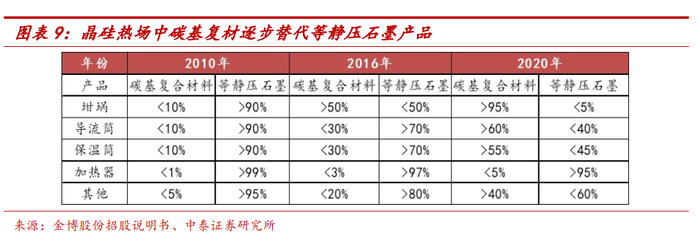 目前应用较为成熟的市场主要是光伏热场领域,光伏热场是用于硅片拉晶过程中的耗材,直接受益于硅片环节大幅扩产。碳碳复材得益于性价比高、安全性强,更适应大尺寸单晶热场制备,对传统等静压石墨材料的替代进程已过半。相较光伏热场材料,半导体热场材料对灰分要求更高,认证壁垒高、周期长,产品供应结构相对稳定,目前仍以高纯等静压石墨产品为主,国产化程度低。随着硅片大型化,碳碳材料的渗透率逐步提升,且在半导体国产化趋势下,半导体热场国产化进程也会提速。