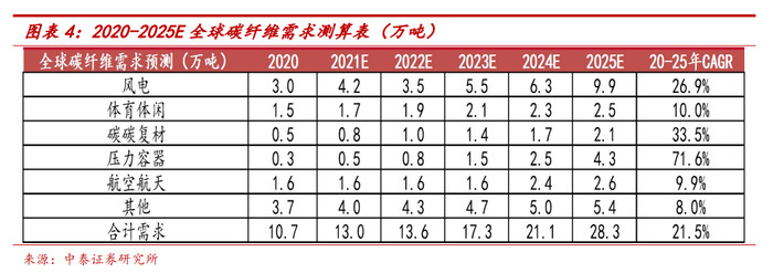 一般而言,用“干喷湿法”工艺生产的“中小丝束”产品对应更高的性能(T700及以上)和需求领域,一般用于航天航空、碳碳复材和氢能等中高端领域;而用“湿法”工艺生产的“大丝束”产品对应T300左右的性能,一般用于风电叶片等对性价比要求较高的工业领域。正是因为生产工艺的差异且短期无法做到“产业化”程度的跨越,供给格局呈现一定的割裂性,这是行业供需短期存在分化的根本原因。从中长期来讲,碳纤维作为替代性材料,大概率是用“价格”换“需求”的长期产业逻辑,不同需求领域的客户亦会根据相应的供给结构调整其复材加工的工艺和技术路径,也就是说中长期来看,不同供给和需求领域从长周期维度价格走势会呈现趋同态势。