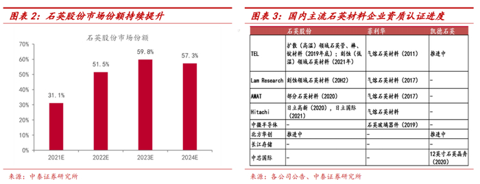 需要强调的是,除了光伏领域,在半导体石英材料领域,公司也呈现明显的稀缺性。公司是全球第三家、国内唯一一家通过海外设备商高温扩散设备领域认证的企业,在半导体国产化以及解决半导体产业链卡脖子的迫切需求下,公司半导体石英材料业务有望再次演绎高纯石英砂发展路径。