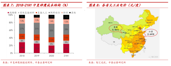 “成本曲线”是行业迈进“1—N”发展阶段必须考虑的问题。碳纤维的成本中制造费用占比在50%以上,而制造费用又以能源(电和蒸汽等)、折旧为主,占到85%左右。除此之外,原材料和人工成本分别占到总成本的30%和15%。制造费用占比高的行业存在明显的规模效应,即可通过总规模及单线规模的扩张实现单位能源消耗、单位人工和折旧的降低,与此同时,龙头企业亦通过选择电价更便宜的基地的选择,实现单位电价和能源价格的降低,比如中复神鹰的万吨基地建在青海西宁,光威复材的新基地建在内蒙古包头。