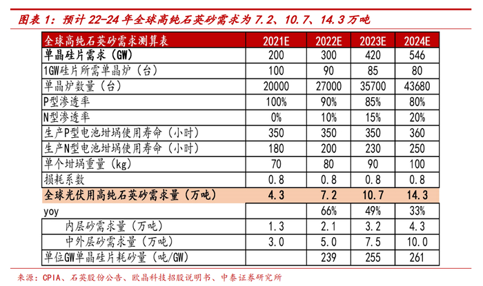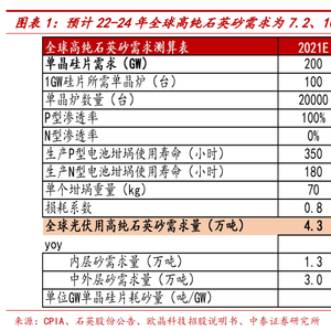 孙颖:我们认为石英股份的股价上涨同时受益于行业beta和公司alpha。石英股份的主要产品高纯石英砂是光伏拉晶环节的耗材。我们通过产业链上下游验证以及各环节详细梳理和测算,判断2022-2024年高纯石英砂需求将持续高增,分别达7.2、10.7、14.3万吨,同比增速为66%、49%、33%。