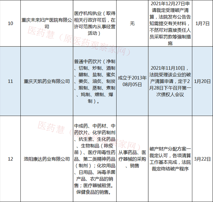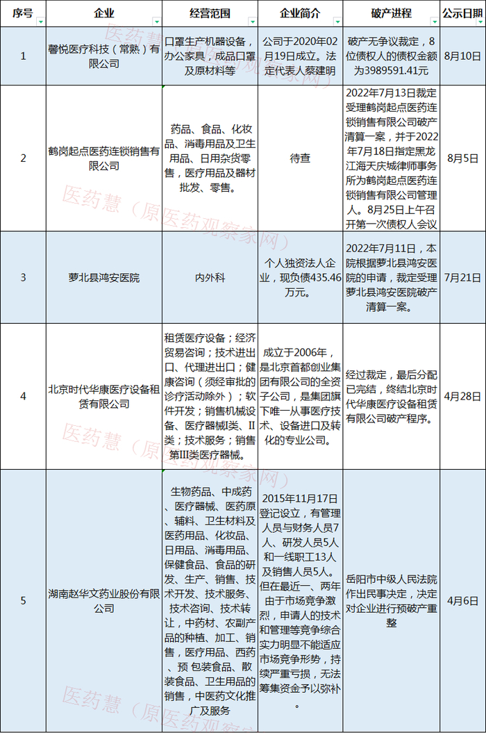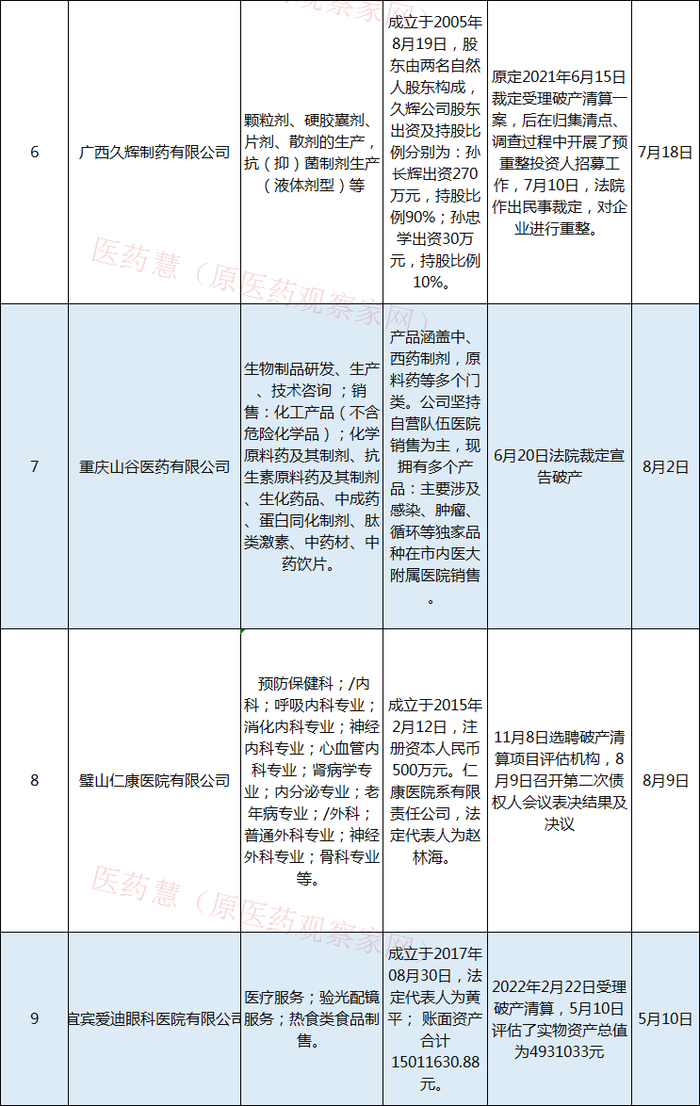 8月12日,医药慧从全国企业破产重整案件信息网了解到,半年来医药/医疗领域又有一批企业破产了!