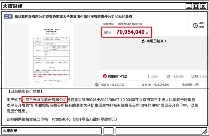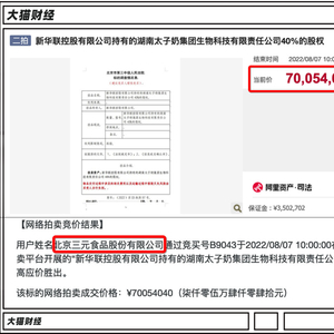 在没有竞争对手的情况下,三元股份以拍卖底价拿到新华联手中持有的湖南太子奶40%的股权,加上此前三元持股的60%,太子奶正式成为了三元的全资子公司。