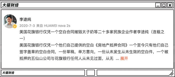 在一口咬定美国人搞死了太子奶的同时,他也不忘炮轰一下后来太子奶的新晋股东新华联,他发文称“鼓励李途纯式实业实体报国,谨防(傅军)空手套白狼圈钱模式”,而此时,傅军已经被李途纯留下的烂摊子,坑得一塌糊涂了。