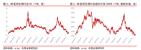 东莞证券医药研究团队的统计显示,截至2022年8月5日,SW医药生物行业整体PE(TTM,整体法,剔除负值)约24.6倍,低于行业2012年以来估值中枢,位于67%的分位;相对沪深300整体PE溢价率为115.2%,处于行业2012年以来相对沪深300溢价率中枢的54%分位。目前估值处于行业近十年来相对低位区域。