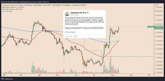 与 LDO 一样,自 7 月 14 日以太坊宣布合并以来,ETC 也上涨了 200% 以上。因此,在合并前后,其继续上涨的可能性很高。