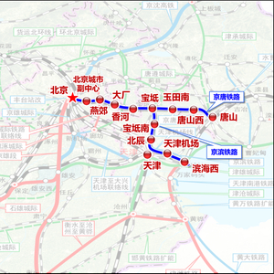 京唐城际铁路起自北京城市副中心站,终至河北省唐山市既有唐山站,途经北京市通州区、河北省廊坊市、天津市宝坻区、河北省唐山市,线路全长约148.7公里,设计最高时速350公里。全线共设置车站8座,分别为北京城市副中心站、燕郊站、大厂站、香河站、宝坻站、玉田南站、唐山西站、唐山站。项目建成初期,列车由北京站始发,至唐山站城际车场。京唐城际铁路是京津冀地区城际轨道交通网的骨干线路,经通燕联络线与京哈线衔接,经唐滦联络线与津秦高铁衔接,是以城际客流为主、同时承担部分中长途跨线客流运输功能的高速铁路。