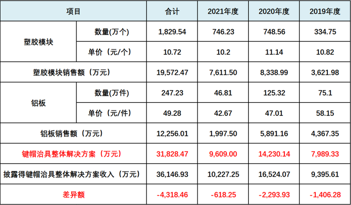 依据发行人披露的键帽生产治具整体解决方案的相关数据,估值之家整理出该核心业务的经销售数量、单价计算的收入与发行人披露的收入差异比较具体见下表: