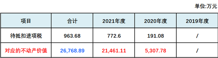 发行人在招股书披露其他流动资产中,2021年度-2020年度分别有待抵扣进项税772.60万元和191.08万元的余额。估值之家依据该金额计算出发行人该两个年度内应该增加的不动产(含在建工程)金额见下表: