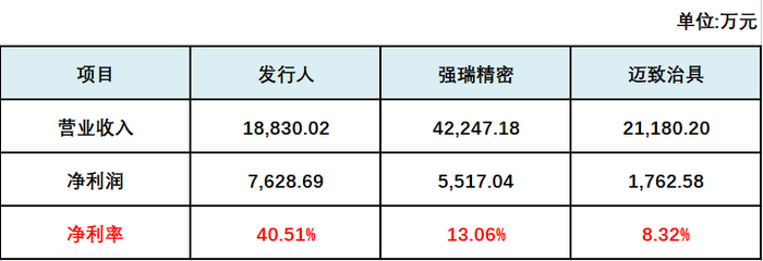 发行人在招股书中披露了强瑞精密和迈致治具两家同行可比上市公司的部分财务数据,我们以此数据为基础并结合发行人的财务报表数据计算出三者2021年度的净利率指标,具体见下表: