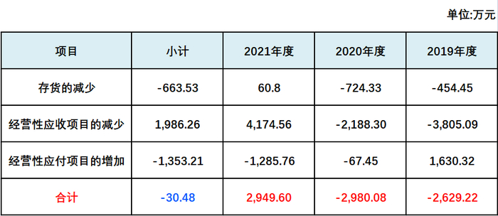 从上表我们看出发行人2021年度和2020年度该三项数据累计为-30.48万元。而估值之家发现如果从发行人现有且对应的资产负债表相关科目数据重新计算后的结果与发行人披露的上表数并不一致且差异巨大,估值之家依据发行人的资产负债表的相关科目重新计算的结果见下表: