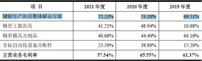 上表中四个收入项目即为发行人四大业务模块,其中以第一个键帽生产治具整体解决方案为第一收入来源,也即发行人的核心业务,该业务收入分别占当期主营业务收入比例自2021年往2019年度分别为55.36%、69.44%以及78.34%。那么一个主营治具制造的企业怎么会有一项叫键帽生产治具整体解决方案平均能占到主营业务收入比例为66.62%的核心业务呢?而且还是报告期内年均1.2亿元的销售水平。