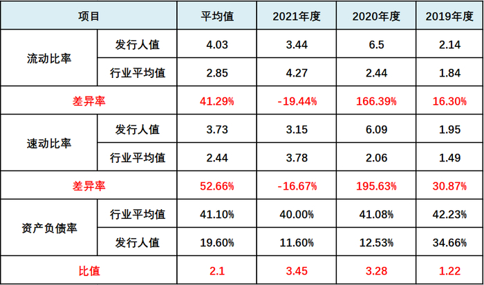 发行人在招股书中披露了流、速动比率和资产负债率与行业平均值的比较情况,估值之家整理了相关数据,并进行了差异分析,具体比较分析情况见下表: