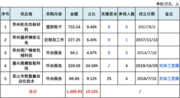 估值之家依据招股书中披露的主要原材料和外协供应商,并根据天眼查系统查询到的供应商相关信息,整理出明显有异常的供应商,具体情况见下表: