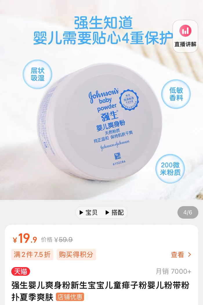 另外,在天猫强生婴儿旗舰店内,强生婴儿爽身粉、强生婴儿热痱粉、强生清凉爽身粉均有销售,交易量十分可观,整体月销量超过7000件。