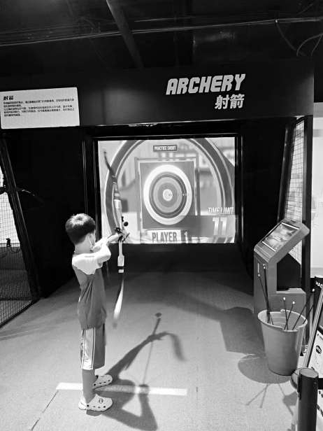 “咱俩去比比射箭吧。”输了拉力冲刺的少年不甘心,又约起了AR射箭。工作人员帮他们调试好弓箭,俩人开始对着屏幕虚拟的箭靶,比起了“百步穿杨”。在这里,足球射门、飞碟射击、棒球击打等运动也都是借助虚拟设备完成,既节约空间,又充满乐趣。