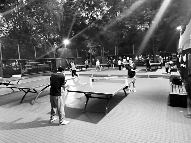 打羽毛球的以中年人为主,而在旁边的乒乓球场,活动的则以老年人居多。这里总共有8张球台,其中有6张都有人在打球。记者观摩了一会,发现大爷大妈的水平还真不低。“可能下雨是有点影响!我们6点就来了,本来后面还一拨儿呢,今天没来。”一位老球友说。