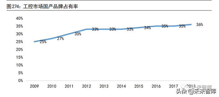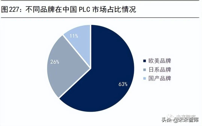 中国 PLC 市场主要由外资品牌主导。欧美品牌主要以西门子、罗克韦尔、施耐德、GE 为代表。西门子在中国市场占而有率 44%,占据领先的市场地位,其大型、中型、小型 PLC 产品的可靠性、稳定性等性能较为良好,在大型、中型PLC市场中具有较强竞争优势,罗克韦尔排名第四,市占率为5%,但是其在大型PLC产品是绝对的龙头;日韩品牌主要以三菱、欧姆龙、LG 为代表。主要依靠较高的性价比和渠道优势占据一定的市场份额,其中以三菱和欧姆龙为代表的日本PLC在小型控制系统等细分领域中应用较多;本土品牌市占率仅11%,主要以信捷电气、汇川技术、麦格米特、和利时为代表,市场规模相对较小,目前本土品牌主要以提供小型 PLC 产品为主。(报告来源:未来智库)