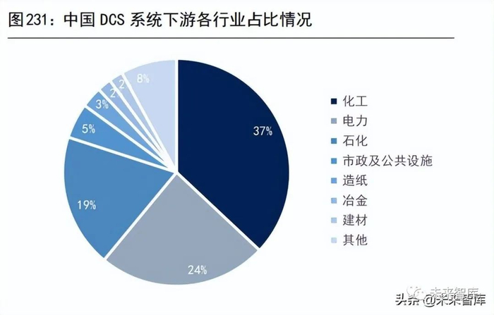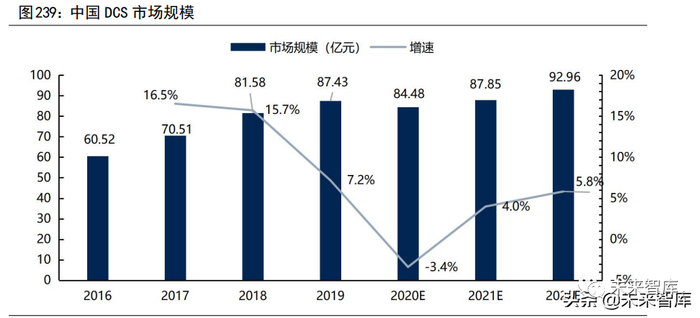 (1)DCS 系统:DCS 是流程工业控制的核心,国内市场处于稳健增长阶段。DCS(DistributedControl System)即集散控制系统,又称“分散控制系统”或“分布式计算机控制系统”,是实现控制生产全流程的“工业大脑”。DCS 控制系统由输入输出模块、通信模块、控制器和人机界面组成,用于实现对生产过程的数据采集、控制和监视功能,主要应用于流程工业领域,下游包括化工、石化、电力、核电、制药、冶金、建筑等。DCS 行业市场规模达到 87.43 亿元,需求主要来自化工、石化、电力等流程工业领域。根据睿工业数据,2019 年,国内 DCS 市场规模为87.4 亿元,同比增长7.2%。工业数字化趋势下,DCS 控制系统作为流程工业智能化的核心,国内市场预计仍会保持 5-6%的年增长率。从下游应用行业来看,2019 年,化工、石化和电力三大行业占据国内 DCS 市场 80.7%的份额,其中化工行业作为DCS 第一大市场,规模达到 32.3 亿元。