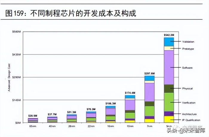 复杂度上升:单个芯片内部的晶体管数量在“摩尔定律”的推动下每18个月翻一倍,如今 5nm 的芯片可以容纳 125 亿个晶体管,未来的3nm 芯片将容纳近 160 亿个晶体管。如果没有一套高度自动化的设计工具与设计流程,这100多亿个晶体管的芯片设计图纸是无法完成,IC 设计早已无法再单纯依赖设计师手工设计,必须依靠 EDA 工具完成电路设计、版图设计、版图验证、性能分析等工作;