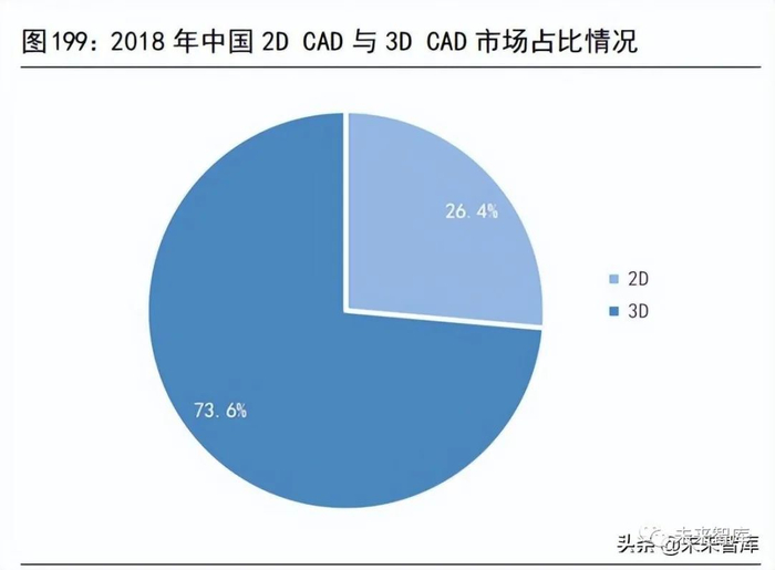 2019 年全球 CAD 市场规模约 93 亿美元。根据海外咨询公司P&S Intelligence的数据,2019 年全球 CAD 市场空间为 93 亿美元,预计2020-2030 年复合增长率(CAGR)为 6.6%。2018 年中国 CAD 市场规模约 36.7 亿人民币。根据中国工业技术软件化产业联盟的数据,2017-2019 年我国研发设计类工业软件的平均市场规模为 270 亿元。根据赛迪咨询的数据,2018 年 CAD 市场占据整个研发设计类软件市场总规模的 13.58%,计算可得 2018 年中国 CAD 的市场规模达到36.7 亿元人民币。2D CAD 与 3D CAD 的市场规模占比保持在 1:3 左右。根据BIS Research的数据,2016 年全球 2D CAD 市场在整个 CAD 市场中的占比是27%,2018 年下降到26.4%。考虑到技术进步及制造业发展等因素,预计未来全球2D CAD 市场所占比例会有小幅度下降;但长期来看,2D CAD 因为简单、便捷等独特优势,不会被3DCAD完全淘汰,故而预测 2D CAD 与 3D CAD 的市场规模会在长期保持在1:3 左右。