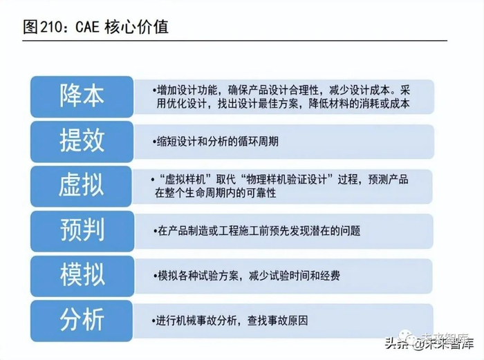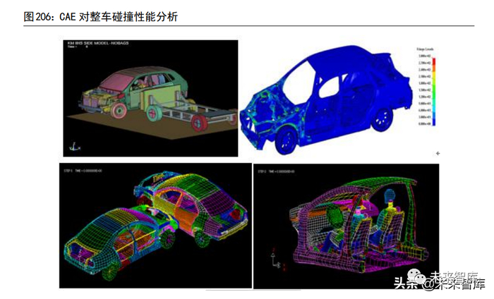 CAE 是制造业核心工业软件之一。计算机辅助工程(CAE)是广泛应用于工业和制造业仿真和模拟的工业软件,与 CAD、CAPP 与 CAM 并称为计算机辅助4C系统。相比于 CAD 侧重于建模和设计,CAE 主要利用计算机技术,求解复杂工程和产品结构强度、刚度、屈曲稳定性、动力响应、热传导、三维多体接触、弹塑性等力学性能的分析计算以及结构性能的优化设计等问题。CAD 负责设计产品,是基础;CAE 负责验证产品性能,一样不可或缺。CAE 把工程的各个环节有机地组织起来,使其产生并存在于工程的整个生命周期,例如 CAE 仿真在整个电动汽车制造中,从电池、电机、驱动、热管理、车灯、防碰撞等各个环节均能提升研发设计能力,大幅节省研发成本和周期。