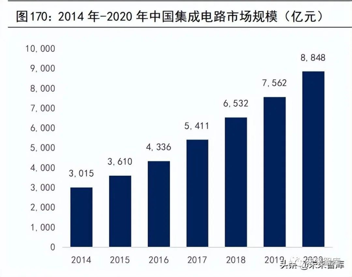中国作为全球规模最大、增速最快的集成电路市场。从2014 年到2020 年,全球集成电路市场规模从 2773 亿美元提升至 3612 亿美元,年均复合增长率4.50%,而同期中国集成电路市场规模从 3,015 亿元提升至8,848 亿元,年均复合增长率达 19.65%。随着集成电路行业专业化分工的趋势加剧,也带动集成电路设计行业市场快速增长,从 2014 年到 2020 年,全球集成电路设计销售规模从881亿美元提升至 1279 亿美元,年均复合增长率 6.41%,而同期中国集成电路设计销售规模从 1051 亿元提升到 3778 亿元,年均复合增长率达23.77%,显著高于同期整个中国集成电路市场的复合增速。根据 GIA 报告,中国 EDA 市场 2020 年至 2027 年复合年增长率预计高达11.7%,中国已经成为全球集成电路市场的重要增长动力。目前中国已经成为半导体产品最大的消费市场,根据 IBS 统计,2019 年中国消费了全球52.93%的半导体产品,预计到 2030 年中国将消费全球 60%左右的半导体产品,旺盛的需求进一步扩大了中国集成电路市场规模。