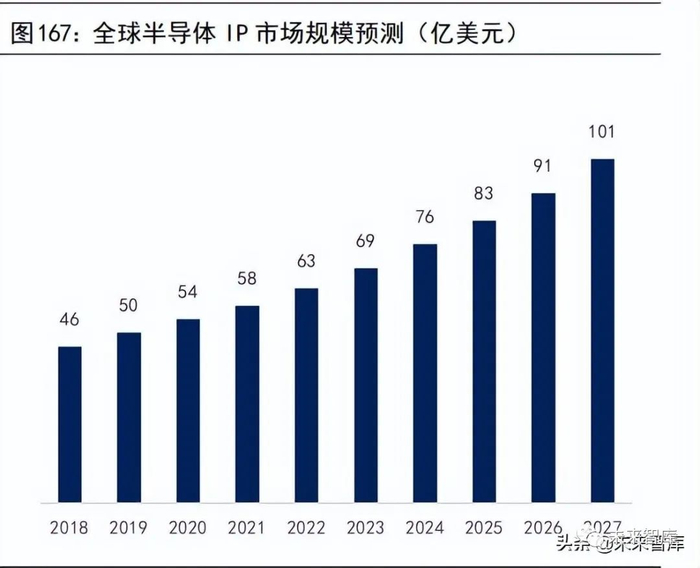 SoC(System on Chip,系统级芯片)技术是从设计的角度出发,将系统所需的组件进行高度集成,将原本不同功能的集成电路以功能模块的形式整合在一颗芯片中。随着 IC 设计步入 SoC 时代,为了加快产品上市时间,以IP 复用、软硬件协同设计和超深亚微米/纳米级设计为技术支撑的 SoC 已成为当今超大规模集成电路的主流方向,当前国际上绝大部分 SoC 都是基于多种不同IP 组合进行设计的。可重复使用的即插即用的 IP 模块,被认为是 SoC 技术中最关键和高效的一环。晶体管数量大幅提升,使得单颗芯片中可集成的 IP 数量也大幅增加。根据IBS数据,以 28nm 工艺节点为例,单颗芯片中已可集成的 IP 数量为87 个。当工艺节点演进至7nm 时,可集成的 IP 数量达到 178 个。单颗芯片可集成IP 数量增多为更多IP在SoC中实现可复用提供新的空间,从而推动半导体 IP 市场进一步发展。根据IBS预测,半导体 IP 市场将从 2018 年的 46 亿美元增长至 2027 年的101 亿美元,年均复合增长率为 9.13%。