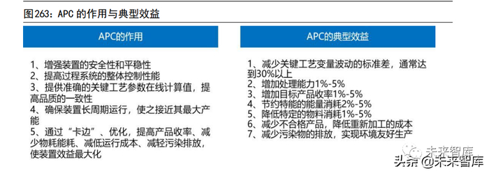 APC(先进控制过程)是实现流程工业生产装置全流程平稳与协调控制的核心工具,通常在 DCS、PLC、FCS 等计算机控制系统已有常规控制的基础上,采用多种策略提高复杂工业过程的控制品质,增强系统的抗干扰能力和鲁棒性,降低劳动强度,实现节能增效的目的。公司是完全自主知识产品的APC 软件供应商,产品已在中石化、中石油、中海油等流程工业企业应用 300 多套,形成了80 多种生产装置先进控制解决方案。RTO(过程实时优化)指通过将回路控制与过程运行优化相结合,来解决复杂流程工业过程优化与控制问题。该产品使生产过程装置类似于汽车自动驾驶和路径最优规划等,实现了装置自动平稳卡边控制和技术经济指标最优化功能,从而提高装置运行整体收益。产品主要用于炼油、石化、化工、冶金、造纸、制药等行业。