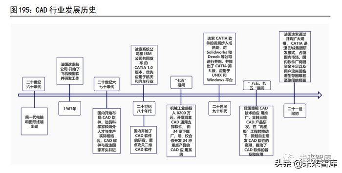 在所有的工业软件中,计算机辅助设计类为研发设计类中的典型代表。计算机辅助设计类软件(CAD)是利用计算机快速的数值计算和强大的图文处理功能,辅助工程技术人员进行产品设计、工程绘图、数据管理、仿真分析、智能制造及智能建造的计算机软件技术。工业软件是工业化长期进程的不可或缺的伴生物,这一点可以从CAD 软件的发展史中得出。工业软件发展成熟的国家是已经完成工业化进程且工业化水平较高的发达国家,比如国际工业设计软件巨头达索就生长在航空航天技术发达的美国。当前,我国虽然已发展形成了一定数量的工业软件企业,在通用软件市场中得到充分成长,但在高端制造领域仍有待突破,随着我国工业化水平的不断提高,将会有一批优秀的工业软件设计厂商跟随成长起来。