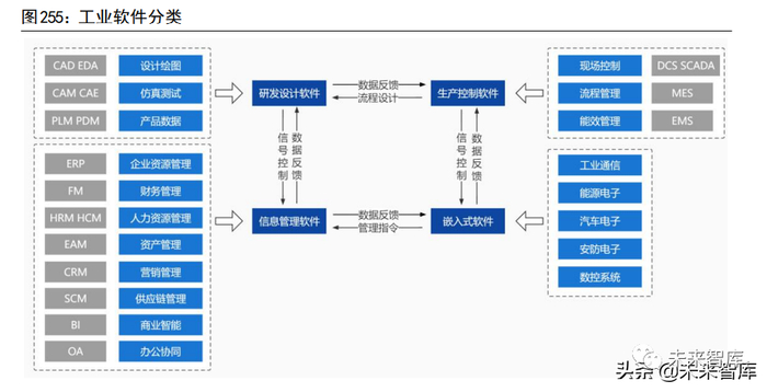 工业软件是工业技术/知识、流程的程序化封装与复用,够在数字空间和物理空间定义工业产品和生产设备的形状、结构,控制其运动状态,预测其变化规律,优化制造和管理流程,变革生产方式,提升全要素生产率。工业软件按不同的应用环节及生产流程,可分为:(1)运营管理类(ERP、CRM等);(2)研发设计类(CAD、PLM 等);(3)生产制造和过程控制类(MES、DCS等),其中企业资源管理计划类、计算机辅助设计类、生产制造执行系统类分别为这三个领域中的典型代表。在工业生产流程中,研发设计类软件和生产控制和过程制造软件、运营管理软件相互协调、相互配合,帮助工业企业提质增效,降低成本,并增强企业在高端制造的竞争力。