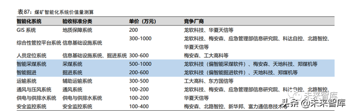 随着国家政策的不断推动以及 5G 等新一代信息技术的有效支撑,我国煤矿智能化化、智能化建设持续加速推进,目前国内智能矿山信息系统的市场竞争较为分散,行业内主要优质公司有龙软科技、梅安森、工大高科等上市公司及北路智控、华夏天信、踏歌智能等非上市公司。其中,龙软科技为全国领先的煤炭地理信息系统与工业软件的提供商;天地科技是全国领先的煤炭智能装备和技术服务商;梅安森致力于物联网技术在矿山安全监测监控与预警领域的应用;北路智控专注于智能矿山相关信息系统;工大高科则是国内煤炭井下轨道信号控制与智能调度的龙头企业。